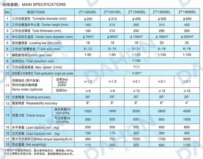 第四軸是各類數控鏜、銑床和加工中心的關鍵配套附件,可以主軸垂直和水平兩種方式安裝在主機工作臺上,用作主機的第四回轉軸。轉臺在主機相關控制系統控制下, 可實現等分的和不等分的孔、槽或者連續特殊曲面的加工,且保證很高的加工精度。 ZT 13E series Hor /vert NC rotary table can carry out the performance of direct and indirect dividing plate proc essing, plateslotting and various cam-curving